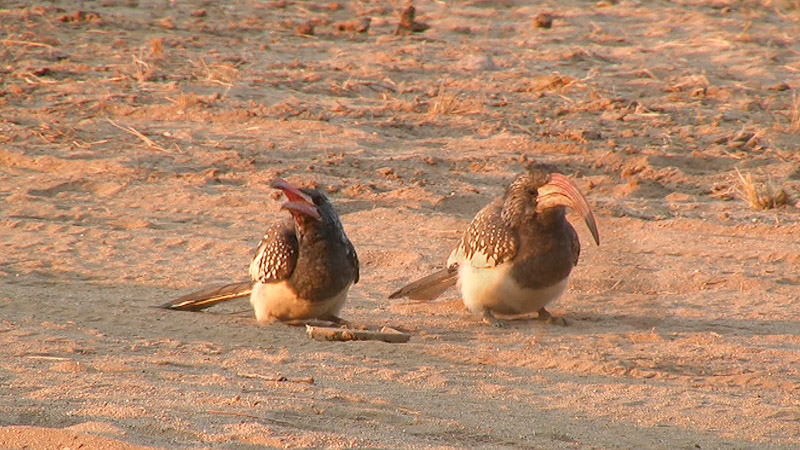 In der Nacht werde ich durch lautes Poltern geweckt. Ich liege im Bett und lausche, was draußen neben dem Zelt vor sich geht. Ich habe in einem Wasserbecken vor dem Zelt unser Trinkwasser zum Kühlen liegen und irgend etwas beschäftigt sich da draußen mit unseren Wasserkanistern. Für einen Moment hoffe ich, daß es doch keine Elefanten sein mögen. Etwas mulmig ist mir schon im Bauch, als ich den Reisverschluß des Zeltes öffne und langsam hinaus in die Dunkelheit gehe. Da sehe ich sie, die Schatten um das Waschbecken. Für Elefanten sind diese allerdings zu klein. Ich gehe näher, die Köpfe heben sich und ich erkenne die Silhouette dreier Esel. Die armen Tiere haben das Wasser gerochen und versuchen nun irgendwie an den Inhalt der Plastikkanister zu gelangen. Ich gehe an die Tiere heran und nehme die Kanister aus dem Becken. Ein Esel versucht in einen Kanister zu beißen, kann diesen mit den Zähnen aber nicht greifen. Ich stecke einen Stöpsel in das Becken und drehe den Wasserhahn auf. Die drei Esel stecken ihre Köpfe in das Becken und beginnen lautstark das frisch eingelassene Wasser lautstark auszuschlürfen. Der Lärm in der sonst stillen Nacht ist gewaltig und ich muß unwillkürlich über diese Szenerie lachen. Ich lasse das Wasser noch 5 Minuten laufen und drehe dann ab. Die Esel schlürfen den letzten Tropfen aus dem Becken und lecken es sogar noch aus. Dann gehe ich wieder ins Bett. Ab und zu poltert noch etwas draußen, aber gleich darauf bin ich schon wieder eingeschlafen. Lautes Zwitschern, Krähen und Gackern vertreibt entgültig meine Müdigkeit und die Neugier treibt mich noch im Halbdunkel der Dämmerung aus dem Zelt. Ich hole unsere Luftmatratze und meinen Schlafsack aus dem Auto, lege mich auf die Terrasse vor dem Zelt und genieße das Erwachen der Natur. Noch ein paar der hellsten Sterne lassen sich am dämmrigen Himmel über mir zwischen den Baumkronen der Bäume ausmachen. Der Brandberg liegt noch tiefgrau im Dämmerlicht und der Erdschatten verschwindet langsam am Süd-West Horizont. Im Nordosten leuchtet schon das orange Licht um den Sonnenaufgang anzukündigen. Im Geäst der Bäume über mir springen einige Gelbschnabel-Tokos und begrüßen mit ihrem lautstarken Gekrächze den beginnenden Tag. Ein leises Gurren hinter mir erregt meine Aufmerksamkeit. Hühnergroße, braungraue Kap-Frankoline suchen im Sand nach Freßbaren. Ihre orangenen Augenlider wetteifern mit dem Licht des Sonnenaufganges. Die oberen Gipfel des Brandberges beginnen förmlich zu glühen. Die nun aufgehende Sonne gießt ihre goldene Farbe gleich Lavaströmen über den Fels. Immer mehr Vögel kann ich beobachten. Schwärme von Webervögel, einzelne Glanzstare, Tauben, Rosenköpfchen und andere Papageien geben lautstark von ihrem Erscheinen Auskunft. Auf dem Tisch neben mir liegt noch etwas Weißbrot. Ich bemerke, wie die Gelbschnabel-Tokos Anstalten machen, an das Brot zu kommen. Ich nehme das Brot und werfe kleine Stücke vor mir in den Sand. Aus den umliegenden Gebüschen kommen mehrere Frankoline angerannt. Zwei Tokos fliegen wie Sturzbomber ein. Ich habe viel Spaß beim Füttern der Vögel und irgendwann kommt Falk aus dem Zelt und kriecht zu mir mit in den Schlafsack. Romantik pur! Zwei Damara der Lodge kommen vorbei und befeuern den Donkey hinter unserem Zelt. Blauer würziger Rauch steigt durch das Ofenrohr in die Morgenluft. Am Wasserbecken, aus denen vergangene Nacht die Esel ihren Durst stillten putzen wir unsere Zähne und Wecken mit kaltem Wasser die Lebensgeister in uns. Wir laufen die paar hundert Meter zum Haupthaus der Lodge um unser Frühstück einzunehmen. Der große aus Basaltsteinen gemauerte Raum wird von einem Reetdach überdeckt. Eine große Glastür nach Osten läßt das Licht der aufgehenden Sonne in den Raum fluten. Unter dem Tisch, direkt im Sonnenlicht sitz aufrecht ein kleines Erdmännchen. Carlos ist sein Name und wird in den nächsten zwei Tagen Falks bester Freund werden. Wir frühstücken ausgiebig und wandern dann wieder zu unserem Zelt zurück. Das Feuer im Donkey ist schon niedergebrannt und ich drehe am Waschbecken das warme Wasser auf. Reflexartig springe ich zurück, denn kochendes Wasser schießt brodelnd aus den Wasserhahn. Nicht auszumalen, was passiert wäre, wenn Falk zuerst das warme Wasser aufgedreht hätte. Ich finde das richtige Mischungsverhältnis um eine angenehme Duschtemperatur des Wassers zu erhalten. Ich rufe Falk und wir beide genießen das Duschvergnügen inmitten der Natur. Frisch und sauber laufen wir wieder unter den Bäumen zum Haupthaus, da einige Vorträge im Rahmen des Sternfreunde-Treffen angekündigt sind. Als wir eintreffen, ist die Veranstaltung schon in vollem Gange. Zirka. fünfzig Personen haben sich eingefunden und selbst aus Windhoek sind interessierte Leute angereist um mehr über den fantastischen Sternenhimmel zu erfahren. Logischerweise ist Falk von den Vorträgen nicht so angetan und vertreibt sich die Zeit am Pool. Mittlerweile ist Falk und Carlos ein unzertrennliches Paar. Das Erdmännchen ist auch ein sympathischer kleiner Kerl. Beim Streicheln legt er sich auf den Rücken und streckt alle Viere von sich. Er reist sein kleines Maul auf als ob er lacht und zeigt dabei seine kleinen spitzen Zähne, die sicherlich unangenehme Schmerzen verursachen können. Zum Glück scheint unser kleiner Freund seine Zähne nur für die Insektenjagd einzusetzen. Nach einem leckeren Mittagessen vertreiben wir uns die Zeit mit Faulenzen am Pool. Der Ergeiz, mein Teleskop doch noch zum Laufen zu bekommen hat mich wieder gepackt und so nutze ich den Nachmittag, um mein Zeug wieder aufzubauen. Ausrichtung nach Süden, Polhöhe einstellen, Tisch und Stühle aufbauen, Computer und Kamera anschließen, alles miteinander verkabeln, so verbringe ich den Nachmittag. Zum Glück ist Falk mit Carlos beschäftigt. Nach dem Abendessen wandern wir wieder zum Beobachtungsplatz. Für Falk habe ich diesmal die Campingliege direkt neben den Telesko