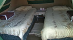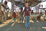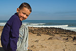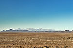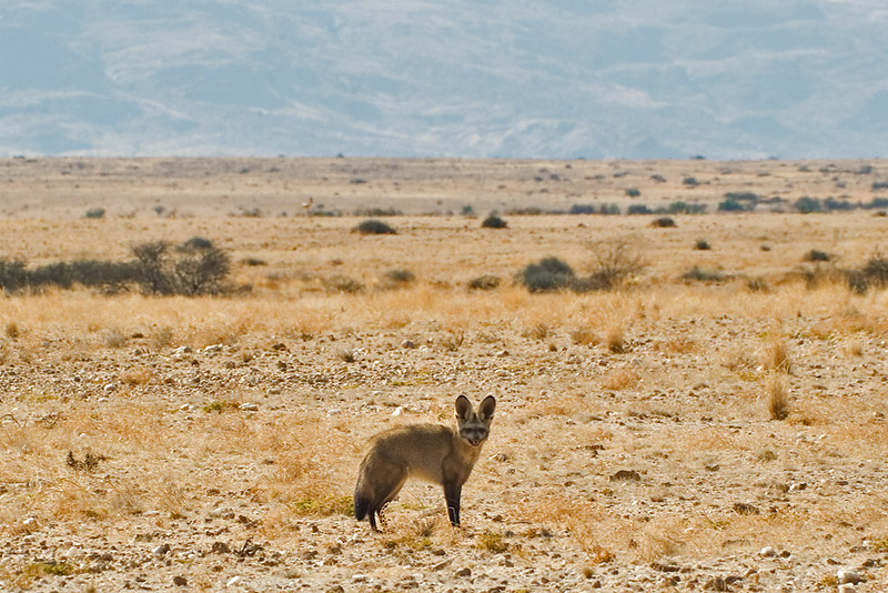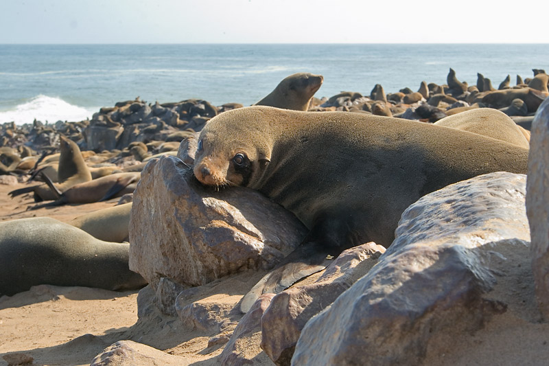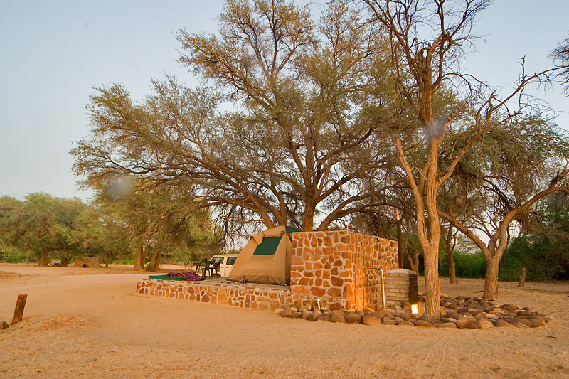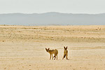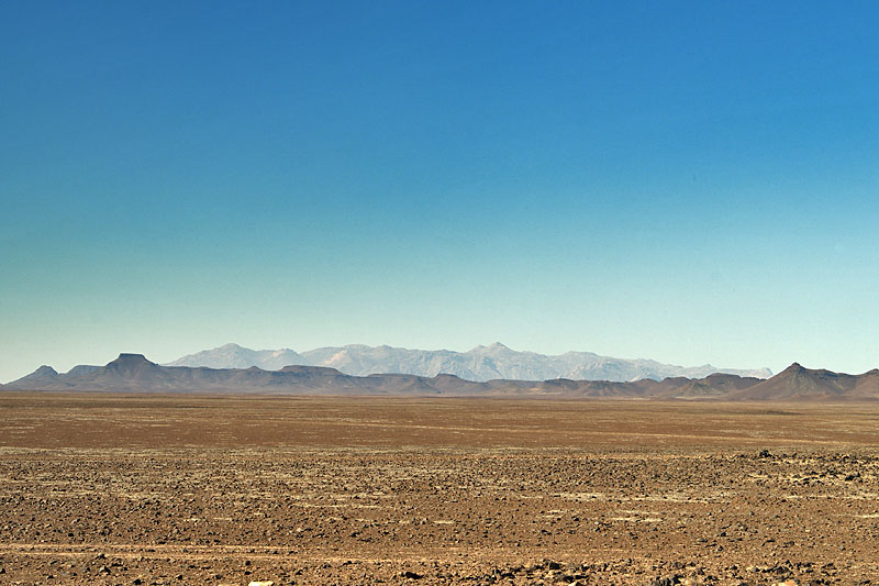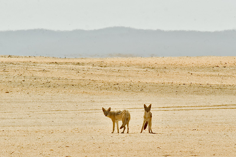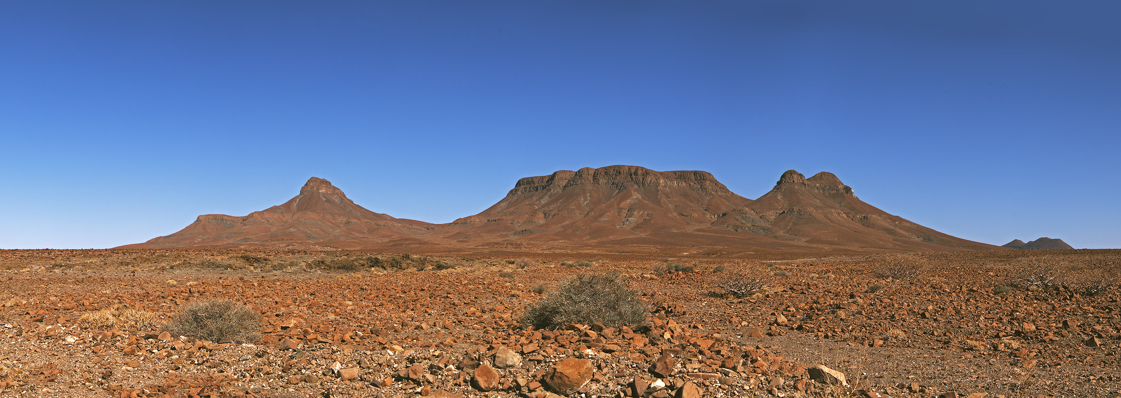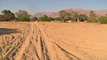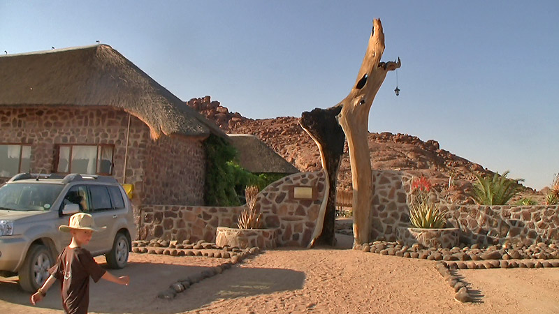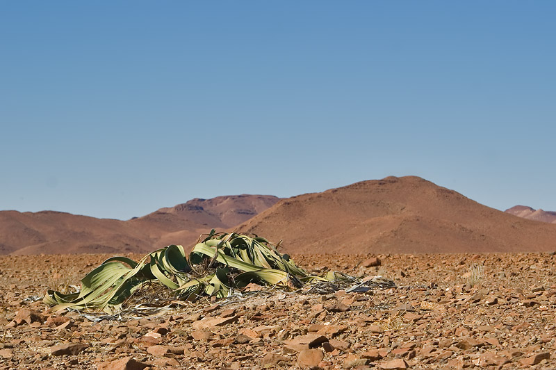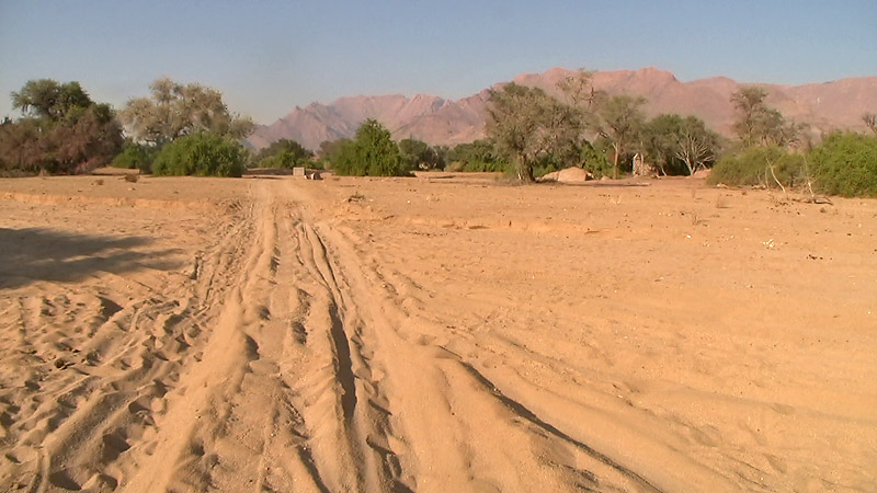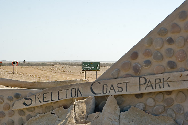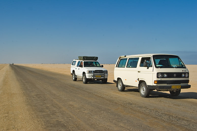 Wir treffen gegen 7.00 Uhr Petra und Jürgen und versorgen uns in einer deutschen Fleischerei mit Proviant für die bevorstehende Reise. Die Verkäuferin bemerkt meinen sächsischen Dialekt, und es stellt sich heraus, daß sie ebenfalls aus Sachsen nur unweit von unserem Wohnort stammt. Dann tanken wir das Auto noch voll und ich kaufe einen zweiten Reservekanisiter. Mit 110 Liter Benzin an Bord starten wir auf der Salzpad in Richtung Norden. Mit einer Mischung aus feuchtem Sand und Salz wird die Fahrbahn befestigt, und nach dem Abtrocknen der Mischung entsteht eine betonharte Fahrbahn. Nur bei dem oft auftretenden Küstennebel muß man höllisch aufpassen, denn dann wird die Fahrbahn glatt wie Schmierseife. Doch wir fahren im hellsten Sonnenschein. Die Landschaft ist recht unspektakulär. Flach wie ein Brett zieht sich die Wüste bis zum Horizont. Salzresistente Gräser wachsen in den feuchten Senken. Später bilden Flechtenfelder die einzige Vegetation in dieser lebensfeindlichen Gegend. Dennoch übt diese Landschaft einen eigenartigen Reiz auf mich aus. Die Salzpad läuft immer gerade aus. Petra und Jürgen fahren voraus. Schilder weisen auf weltbekannte Angelplätze an der Küste hin. Jakalsputz, Hentjesbay, Mile 72, all diese Orte wirken auf uns nicht gerade sehr einladend und so fahren wir zügig weiter nach Norden. Weit in der Ferne, durch die heiße, flimmernde Luft unwirklich verzerrt lassen sich Berge erahnen. Schließlich erreichen wir Cape Cross. Hier können wir eine große Robbenkolonie hautnah erleben. Wir zahlen einen kleinen Obolus als Eintrittsgebühr. Eine kleine Mauer trennt die Kolonie von den Besuchern. Dicht an dicht drängen sich tausende Robben. Ein fantastischer Anblick. Der berüchtigte Fischgestank hält sich in Grenzen. Jedenfalls hatten wir gestern im Hafen von Walfishbay schlimmeres erlebt. Mit der Fotokamera bewaffnet lege ich mich in den Sand und krieche die wenigen Meter bis direkt an die Robben heran. Eine kleines Robbenbaby liegt blinzelnd auf ihrer Mutter und säugt genüßlich die fettreiche Milch. Die Tiere lassen sich von mir nicht stören. Am Strand tobt die Brandung und überall sehen wir in dem Getöse Robben schwimmen. Vereinzelte Schakale laufen durch die Kolonie, immer auf der Suche nach toten oder verletzten Tieren. Die Geräuschkulisse ist gewaltig. Das Gebrülle der Robben steht im starken Kontrast zur Stille der Wüste, welche wir in den letzten Tagen erleben konnten. Wir kaufen noch ein paar Andenken aus Robbenfell und besprechen mit Petra und Jürgen die weitere Strecke. Ich hatte ja schon gestern meinen Wunsch geäußert, nach Norden bis an das Ugab-Tor –dem Eingang zur berühmten Skelettküste– zu fahren. Das ist allerdings ein Umweg von ca. 140km, was für ein paar Fotos vom Tor mit den Totenköpfen schon etwas verrückt erscheint. So hatte ich mir die Idee schon aus dem Kopf geschlagen. Nun fängt Jürgen noch einmal mit dem Thema an und kurz darauf sind wir uns einig und fahren auf der Salzpad mit hoher Geschwindigkeit in Richtung Ugab-Tor. Wir erreichen den Abzweig zum Brandberg, welchen wir vorerst ignorieren und in Rekordzeit liegt der Eingang zum Nationalpark „Skelettküste“ vor uns. Das oft fotografierte Tor mit seinen zwei Totenköpfen und den gekreuzten Knochen, davor ein paar große Walknochen geben wirklich ein tolles Fotomotiv ab. Der Parkranger, ein Damara, lebt schon seit einigen Jahren hier in dieser Einsamkeit. Und kommt nur aller paar Monate zum Einkaufen nach Swakopmund. Na wenn man da nicht einen Wüstenkoller bekommt! Wir verabschieden uns und fahren die siebzig Kilometer zurück zum Abzweig auf die D2303. Diese Pad ist in gutem Zustand und so fahren wir zügig weg von der Küste in das Landesinnere. Das Gesicht der Landschaft ändert sich. Die weite, staubige Ebene, welche das Gesicht der Küste prägete, wird zu von Felsbrocken und kleinen Bergen umsäumten Trümmerlandschaft. Schokoladenbraun leuchten die Basaltbrocken in der Mittagssonne. Wir haben die Ausläufer der Vulkanlandschaft des Messum-Krater erreicht. Vor 130 Millionen Jahren spieen hier Vulkane ihre Lava aus. Wer auf der Suche nach den berühmten Welwitschia-Pflanzen ist, der wird hier reich belohnt. Hunderte dieser lebenden Fossilien wachsen in dieser Schotterlandschaft. Natürlich machen wir hier auch einen Fotostopp. Wir kommen uns vor wie in eine Backofen. Kein Wind regt sich und die Heiße Luft flimmert über der Landschaft. Ohrenbetäubende Stille umgibt uns. Nur der Herzschlag und das Rauschen des Blutes stört die Stille. Bedrückend, aber schön. Falk hat sich wieder in den VW-Bus zurückgezogen und hört Musik über den MP3-Player. Wir warten noch auf Petra und Jürgen, die ein ganzes Stück hinter uns gefahren sind. So laufe ich durch die Basaltfelder und betrachte die Welwitschias. Interessant sind diese Pflanzen schon, aber nicht besonders hübsch. Die Welwitschia ist als Nacktsamer eher mit unseren Nadelbäumen verwand. Aus dem Zentrum der Pflanze wachsen unentwegt zwei lederige Blätter. Die Enden der mehrere Meter langen Blätter liegen zerzaust und verknäult auf dem Wüstenboden und sterben an den Blattenden ab. Der Küstennebel verfängt sich in auf der Blattober-fläche und tropft auf den Wüstenboden, wo das Wasser versickert und durch ein weit verzeigtes Wurzelgeflecht der Pflanze aufgenommen wird. Angeblich sind manche Exemplare der Welwitscha über tausend Jahre alt. Ich höre ein leises Brummen. Zwei, drei Minuten später sehe ich in der Ferne eine Staubfahne. Noch eine geraume Zeit vergeht und das Auto unserer Reisegefährten erscheint allmählich verschwommen im Luftgeflimmer. Nun fahren wir Petra und Jürgen hinterher und die Landschaft wird immer spektakulärer. Wir erreichen schließlich in einem tief eingeschnittenen Seitental des Ugab-Riviers den Abzweig der Pad zur Brandberg-West-Mine. Hier biegen wir nach rechts auf die Pad 2342 in Richtung Uis. Das canyonartige Tal liegt wieder hinter uns und die Weite der V
